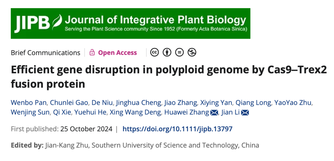 Pan, W., Gao, C., Niu, D., Cheng, J., Zhang, J., Yan, X., Long, Q., Zhu, Y., Sun, W., Xie, Q., He, Y., Deng, X.W., Zhang, H. and Li, J. (2024). Efficient gene disruption in polyploid genome by Cas9–Trex2 fusion protein. J. Integr. Plant Biol. https://doi.org/10.1111/jipb.13797