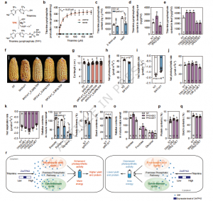 理论意义:首次阐明ZmTPK2通过调控TPP代谢,同步协调线粒体TCA循环、叶绿体碳固定和氮利用的分子机制;发现玉米幼穗可局部合成硫胺素,完善了植物硫胺素代谢模型。
