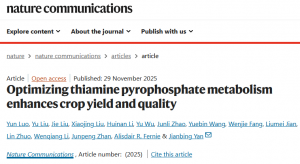 近日,Nature Communications 在线发表了一篇题为《Optimizing thiamine pyrophosphate metabolism enhances crop yield and quality》的研究论文,华中农业大学严建兵教授研究团队揭示了硫胺素焦磷酸(TPP)代谢在调控玉米穗长与产量中的关键作用,同时提供了可落地的作物增产方案,对作物遗传育种与田间生产具有重要指导意义。