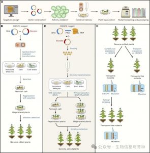 植株再生(组织培养): 将编辑后的细胞在无菌条件下培养成完整植株。