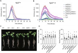 图4. 大豆 GmFLS2a 和 GmFLS2b 参与 flg22 诱导的免疫反应并调控结瘤